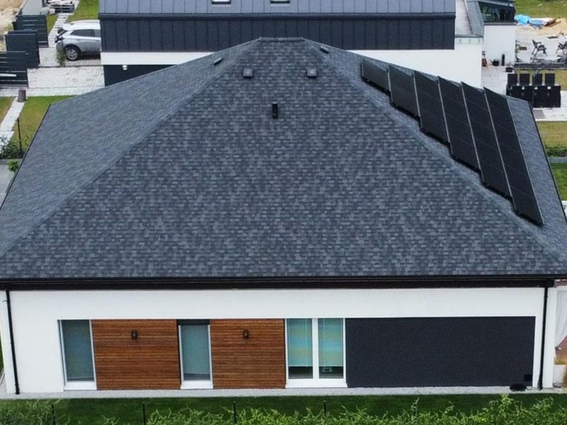 Dom jednorodzinny ogrzewany foliami grzewczymi zamontowanymi na suficie, zasilany dodatkowo instalacją fotowoltaiczną.